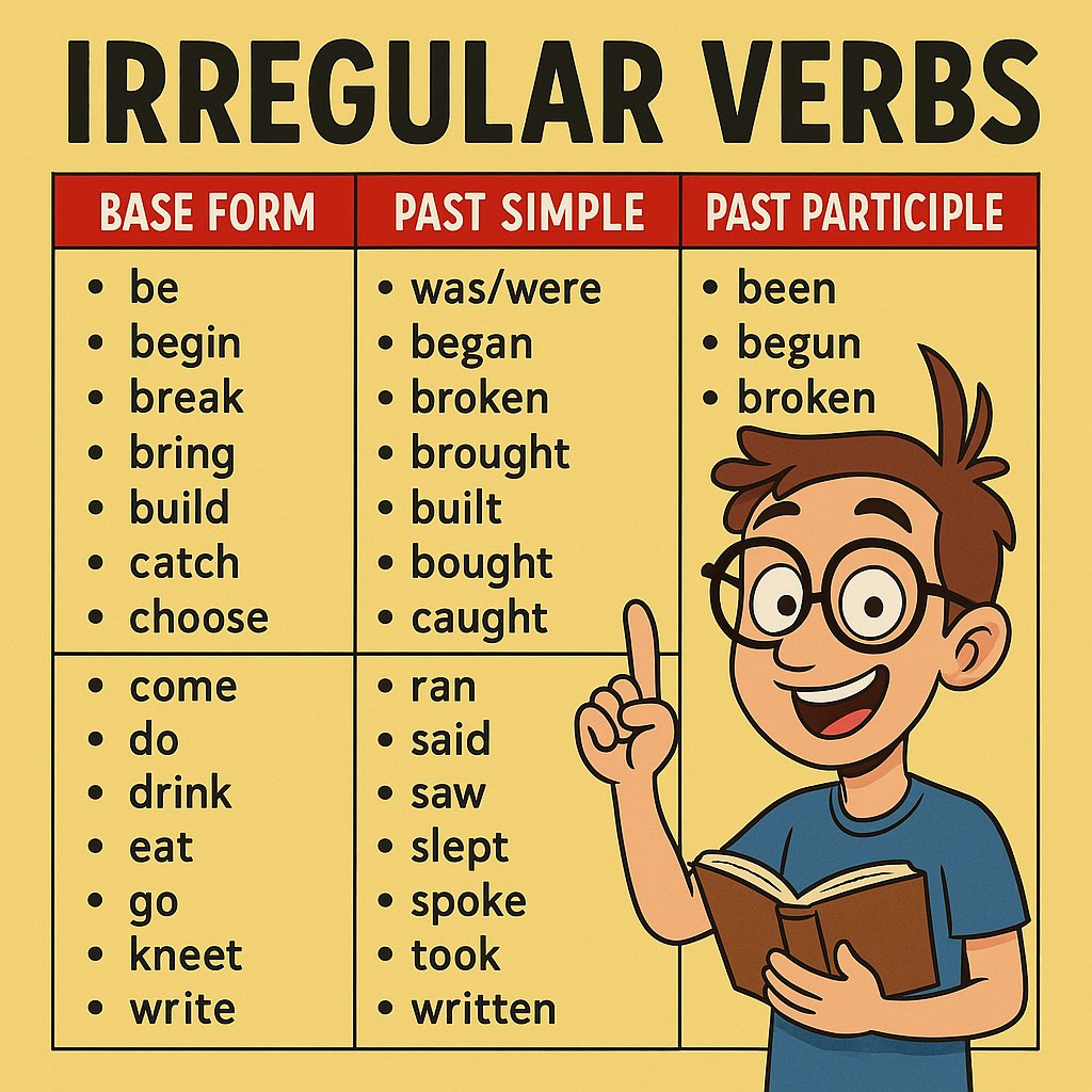 - Irregular Verbs: Do not follow a single pattern; their forms must be memorized.
