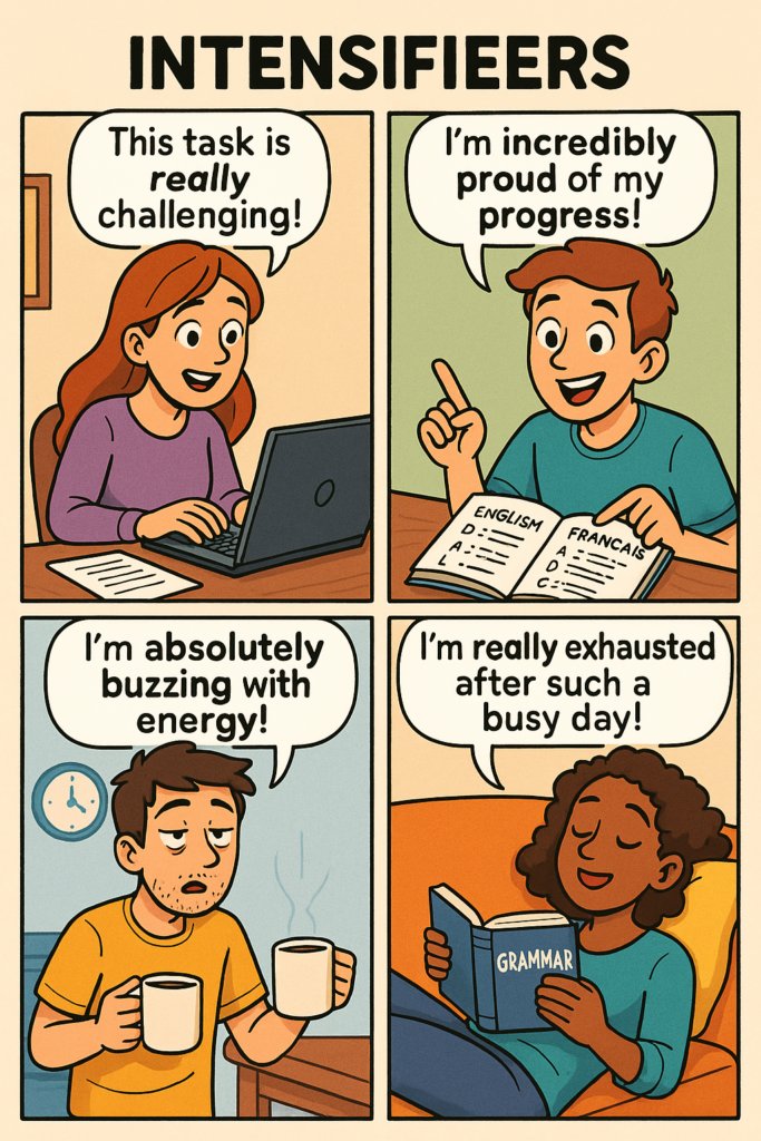 In this lesson, we will explore intensifiers—words or phrases that are used to make adjectives, verbs, or other adverbs stronger. By the end of this lesson, you’ll be able to use intensifiers naturally in your conversations and writing.